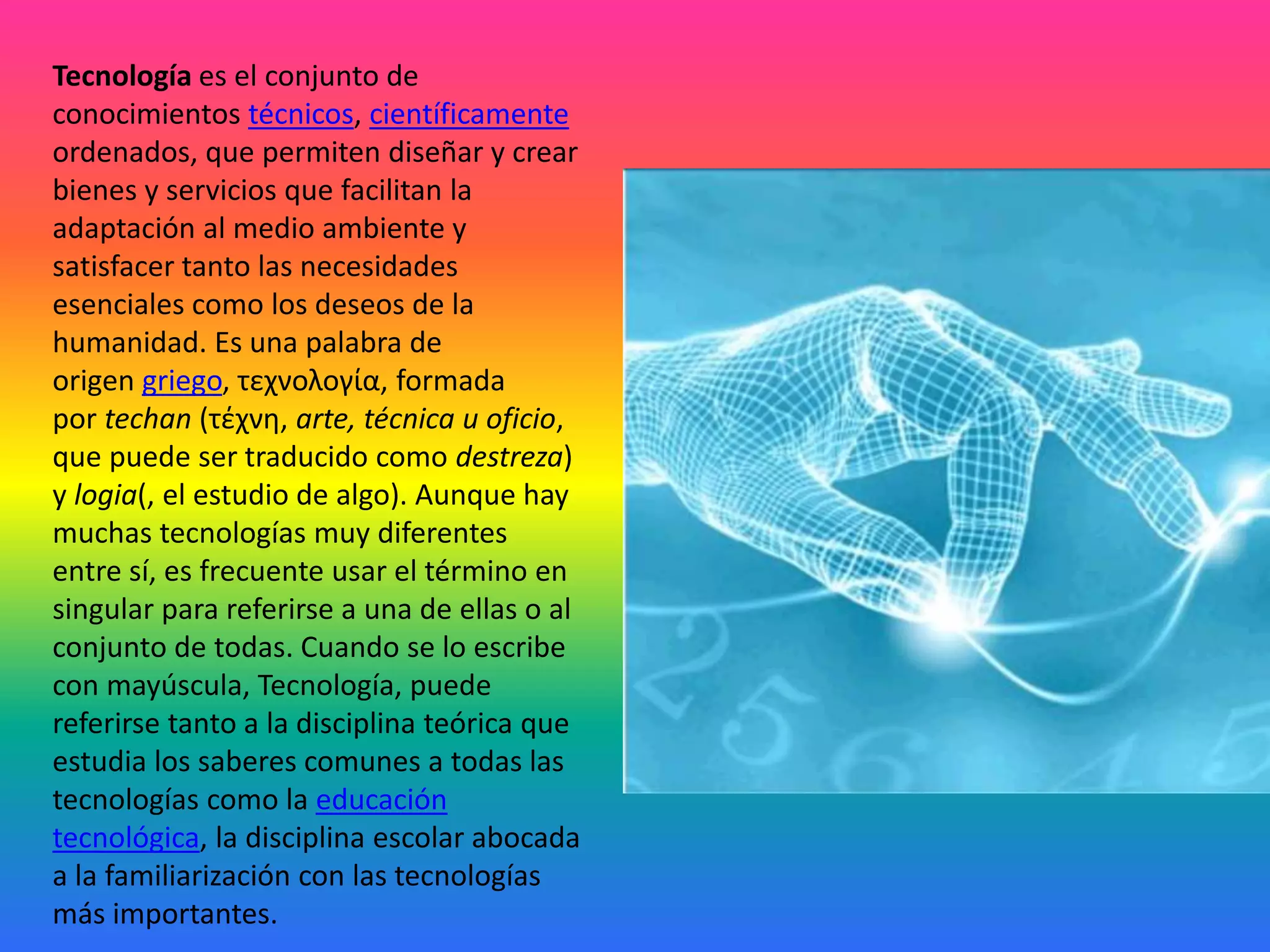 La tecnología es el conjunto de conocimientos técnicos y científicos que permiten crear bienes y servicios para satisfacer las necesidades humanas y facilitar la adaptación al medio ambiente. Johann Beckmann fue la primera persona en enseñar tecnología como una disciplina académica y acuñó el término "tecnología" para referirse al estudio de las artes y oficios. Su enfoque reflejaba los escritos ilustrados de la época sobre análisis de procesos técnicos.