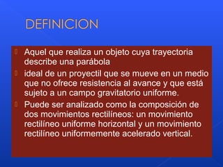 El documento describe el movimiento parabólico, el cual puede analizarse como la composición de dos movimientos rectilíneos: un movimiento horizontal uniforme y uno vertical acelerado por la gravedad. Explica que el movimiento parabólico completo implica un lanzamiento inicial con ángulo respecto a la horizontal, descomponiendo la velocidad en componentes horizontal y vertical.