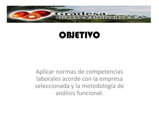 El documento presenta la información de GRADESA S.A., una empresa líder en la producción y comercialización de grasas y aceites derivados de la palma de aceite en Colombia. La empresa fue fundada en 1992 y se ha convertido en líder nacional para 2014. Su misión es producir y comercializar productos de calidad que satisfagan las necesidades de sus clientes nacionales e internacionales, además de fomentar la productividad de sus proveedores de fruto de palma. La visión de la empresa es ser líder nacional en la producción de emulsionados