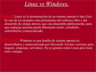 Este documento compara Linux y Windows, señalando que Linux es un sistema operativo de código abierto gratuito mientras que Windows es desarrollado y vendido por Microsoft. Linux es recomendado para usuarios con conocimientos de informática, mientras que Windows es más fácil de usar pero tiene más problemas y virus. Al final, el documento concluye que ambos sistemas tienen ventajas y desventajas dependiendo del tipo de usuario.