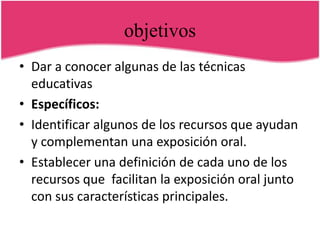 Este documento describe diferentes recursos audiovisuales que pueden usarse para apoyar presentaciones orales, incluyendo pósters, tableros, franelógrafos y retroproyectores. Explica las características y usos de cada recurso.