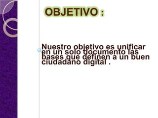Este documento define las características de un buen ciudadano digital y los comportamientos que debe adoptar. Un ciudadano digital utiliza las herramientas tecnológicas de manera consciente, responsable, respetuosa y legal. Debe respetar los derechos y deberes ciudadanos tanto en el mundo virtual como en la vida real, reconociendo que el uso de la tecnología implica responsabilidades hacia uno mismo y los demás. El documento enumera 10 comportamientos digitales clave como el respeto, la libertad, la seguridad, la responsabilidad