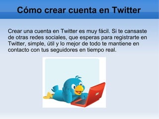 Este documento proporciona instrucciones para crear una cuenta en Twitter en 4 pasos. Explica cómo ingresar a la página de Twitter, completar el registro con información personal y de contacto, seguir cuentas sugeridas y buscar amigos, y confirmar la cuenta a través de un enlace de verificación enviado por correo electrónico. También brinda una breve descripción de Twitter como un servicio gratuito de red social para enviar y recibir mensajes ("twists") de hasta 140 caracteres que se comparten en los perfiles de usuario y seguidores.