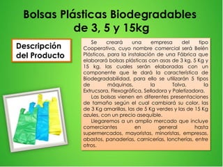 Este documento describe la creación de una cooperativa llamada Belén Plásticos que fabricará bolsas plásticas biodegradables de 3 kg, 5 kg y 15 kg utilizando máquinas como tolva, extrucsora, flexográfica, selladora y paletizadora. Las bolsas se venderán a comerciantes, supermercados y empresas. El objetivo es determinar la factibilidad del mercado para esta fábrica y satisfacer la demanda local y regional de bolsas ecológicas.