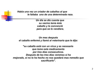 Un caballo enfermó y el veterinario dijo que si no mejoraba en 3 días tendría que ser sacrificado. Un cerdo escuchó esto y animó al caballo a levantarse los 3 días para tomar su medicina. Al tercer día, el caballo se recuperó gracias a los esfuerzos del cerdo. Sin embargo, cuando el dueño del caballo vio que se había curado, decidió matar al cerdo para celebrarlo en lugar de reconocer el papel que jugó.