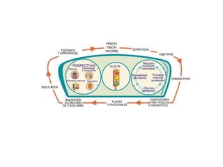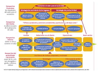 El documento describe los pasos para implementar una estrategia corporativa exitosa, incluyendo construir la estructura organizacional, establecer vínculos estratégicos, determinar métricas clave, identificar procesos y proyectos, convertir las estrategias en acciones mediante la asignación de responsabilidades, y crear tableros de mando para un seguimiento continuo que involucre a toda la empresa.
