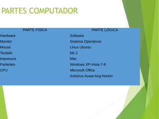 Este documento describe las partes principales de un computador, incluyendo el hardware como el monitor, teclado, mouse, impresora y torre, y el software como sistemas operativos y aplicaciones. Explica que el computador puede almacenar y procesar grandes cantidades de información a alta velocidad, y que la velocidad de procesamiento depende de las características del hardware. Además, detalla los diferentes tipos y funciones de los periféricos de entrada y salida como monitores, teclados, mouses e impresoras.