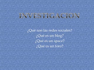 Este documento define y explica varias formas de comunicación en Internet como las redes sociales, blogs, espacios (spaces) y foros. Las redes sociales consisten en estructuras sociales de personas conectadas por relaciones como amistad. Un blog es un sitio web actualizado periódicamente que recopila artículos de uno o más autores en orden cronológico. Un space es una página personalizada que agrupa servicios como fotos, videos y chat. Un foro representa un segmento de la sociedad donde personas mantienen conversaciones sobre un tema común