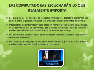Este documento describe avances tecnológicos relacionados a los cinco sentidos que podrían ocurrir en los próximos cinco años. Se mencionan sistemas que permitirán a las computadoras escuchar el entorno y detectar peligros, equipos con sensores de olor que puedan diagnosticar enfermedades, tecnología para simular el sentido del gusto y crear recetas saludables, y aplicaciones táctiles que permitan simular texturas a través de pantallas de teléfonos.
