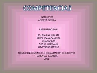 Este documento presenta una introducción a los conceptos de competencias e incluye las diferentes clases de competencias como competencias laborales, básicas, axiológicas, biofísicas, comunicativas y lógico-matemáticas. También define la formación profesional integral y sus componentes de formación intelectual, humana, social y profesional. Explica la formación por proyectos y sus fines de formar competencias y resolver problemas contextualizados.
