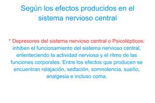 Este documento clasifica las drogas según sus efectos en el sistema nervioso central, distinguiendo entre depresores, estimulantes y alucinógenos. También diferencia entre drogas duras y blandas en función de si causan adicción física y psíquica o solo una de ellas. Finalmente, separa las drogas en legales e ilegales.