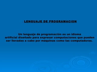 El documento habla sobre los lenguajes de programación. Explica que un lenguaje de programación es un idioma artificial diseñado para expresar computaciones que pueden ser llevadas a cabo por máquinas como las computadoras. Luego resume brevemente la historia de los primeros lenguajes de programación y menciona algunos lenguajes de alto nivel importantes como FORTRAN, COBOL, Pascal, Modula-2 y Logo, indicando quien los creó y en qué año.