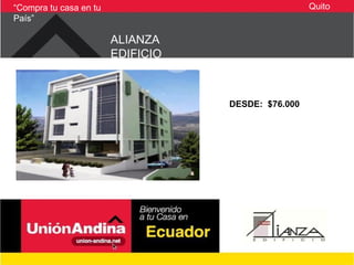 Este anuncio promueve la venta de un departamento de 76 metros cuadrados en el proyecto Alianza Edificio en Quito. El departamento tiene dos dormitorios, sala, comedor, cocina y parqueadero y se vende por $76,000. Se encuentra ubicado en la Calle E entre las avenidas Juan de Selis y Tadeo Benitez en el sector norte de Quito.