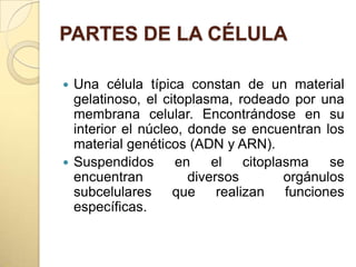 La célula es la unidad básica de la vida. Consta de citoplasma rodeado por una membrana celular que contiene el núcleo con el material genético. Dentro del citoplasma se encuentran diversos orgánulos que realizan funciones específicas. La forma y tamaño de la célula varían según su función, desde 0,3 micras en microorganismos hasta grandes células como las yemas de huevo de aves. Las células pueden ser procariotas u eucariotas.