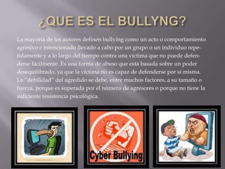 El documento describe el bullying y el ciberbullying. Define el bullying como un acto agresivo repetido contra una víctima que no puede defenderse. Explica que existen dos formas de bullying: directo e indirecto. Además, describe cómo afecta el bullying a las víctimas física y psicológicamente. Define el ciberbullying como una forma de acoso verbal y escrito a través de medios electrónicos como mensajes y publicaciones en línea. Explica las siete categorías de ciberbullying y cómo, a diferencia del bullying tradicional, el