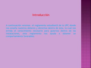 Este documento describe el reglamento estudiantil de la Universidad Popular del Cesar. Explica que el reglamento establece las normas de comportamiento, horarios, uniformes y sanciones para los estudiantes. También define los derechos y deberes de los estudiantes y docentes. El reglamento promueve la convivencia, sentido de pertenencia y desarrollo de los estudiantes.