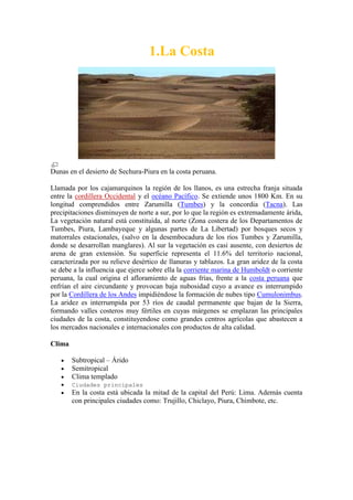 El documento describe las tres regiones geográficas principales del Perú: la Costa, la Sierra y la Selva. La Costa se extiende a lo largo del océano Pacífico y tiene un clima desértico. La Sierra comprende la región andina con altas montañas y valles. La Selva amazónica cubre la mayor parte del territorio peruano y tiene un clima cálido y húmedo. Cada región tiene sus propias características de clima, vegetación, ciudades principales y recursos naturales.