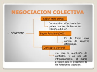 Este documento trata sobre la negociación colectiva de sindicatos. Explica conceptos clave como la negociación colectiva, sus características, estrategias, tipos de técnicas, resolución de conflictos laborales, ámbito de aplicación, titularidad, límites e intervención del inspector de trabajo. Además, destaca la importancia de crear un comité de evaluación y seguimiento de las convenciones colectivas.