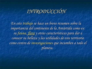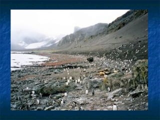 La Antártida es el continente más remoto e inhóspito de la Tierra. Consiste en una gran masa de tierra y numerosas islas cubiertas casi en su totalidad por hielo. El clima es extremadamente frío, con temperaturas récord de hasta -88°C. La flora y fauna se limitan a pocas especies adaptadas a las duras condiciones, como el krill y diferentes tipos de pingüinos y ballenas. La Antártida no tiene población humana permanente debido a su duro clima y sirve principalmente como centro