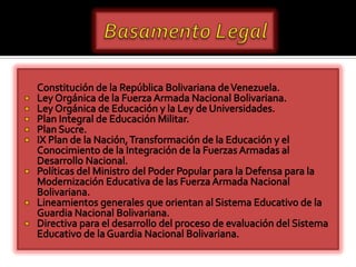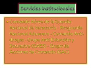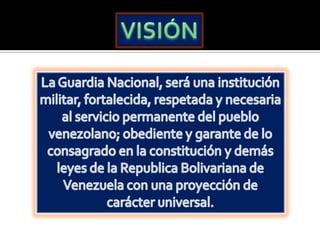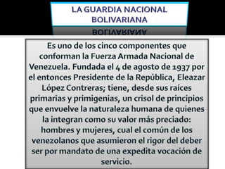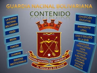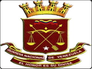 Este documento presenta la estructura jerárquica de la Guardia Nacional Bolivariana de Venezuela, que va desde los rangos más bajos de Soldado Distinguido y Cabo hasta los más altos de General en Jefe. También describe las funciones de la Guardia Nacional como mantener el orden interno, cooperar en operaciones militares de defensa, ejercer funciones policiales y participar en el desarrollo nacional.