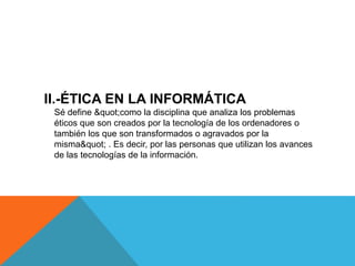 El documento trata sobre la ética en la informática. Explica que la ética informática analiza los problemas éticos creados o transformados por la tecnología de la información y su uso. También habla sobre la ética del usuario y los diez mandamientos de la ética informática. Finalmente, menciona aspectos legales relacionados con los derechos de autor y delitos informáticos.