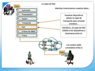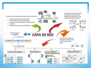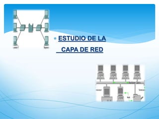 Este documento resume los conceptos clave de la capa de red. Explica que la capa de red se encarga de enviar y enrutar paquetes de datos entre dispositivos conectados a través de diferentes tecnologías de red. También describe algunos protocolos empleados como TCP/IP y características de redes como LAN y WAN.