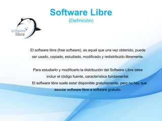 El documento presenta una introducción al software libre, definiéndolo como software que puede ser usado, copiado, modificado y redistribuido libremente siempre que incluya el código fuente. Luego describe las cuatro libertades que garantiza el software libre y algunas de sus ventajas como no requerir licencias, ser un beneficio social y tecnológico, y permitir la libertad de copia, modificación y mejora. Finalmente, contrasta el software libre con el software propietario en términos de libertades y permisos sobre el código