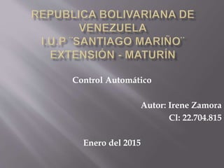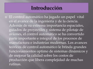 Este documento trata sobre el control automático. Explica que el control automático ha sido vital para el avance de la ingeniería y la ciencia, especialmente en procesos espaciales, de fabricación e industrias modernas. También describe brevemente algunos de los primeros desarrollos del control automático a través de la historia y los componentes básicos de un sistema de control, incluyendo objetivos de control, lazos abiertos y cerrados, y diferentes clasificaciones de sistemas de control.