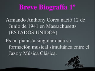 Chick Corea nació en 1941 en Massachusetts y es un destacado pianista estadounidense con formación tanto en jazz como en música clásica. Su álbum de 1968 "Now He Sings, Now He Subs" resume su carrera ecléctica y exitosa, la cual incluye formar parte del grupo The Elektric Band en 1985 y ganar varios Premios Grammy, además de alcanzar popularidad por su participación en el disco de jazz rock.