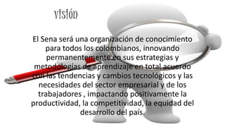El documento presenta la visión, misión, logotipo e himno del Sena de Colombia. Su visión es ser una organización de conocimiento para todos los colombianos que innove permanentemente en sus estrategias de aprendizaje de acuerdo con las necesidades del sector empresarial. Su misión es ofrecer formación profesional integral para contribuir al desarrollo del país. El logotipo representa los sectores económicos en los que se enfoca el Sena. El himno motiva a los estudiantes a luchar por Colombia con amor y transformarla en un