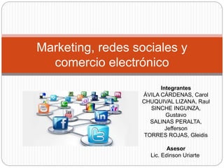 Este documento trata sobre marketing, redes sociales y comercio electrónico. Se divide en tres capítulos principales que cubren la definición y ventajas del marketing, un análisis de redes sociales como Facebook, Twitter, blogs y YouTube, y los tipos y beneficios del comercio electrónico para empresas y clientes.