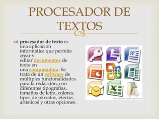 Microsoft Word es un procesador de textos creado por Microsoft, que permite crear y editar documentos con múltiples funcionalidades. Está integrado en la suite ofimática Microsoft Office y ha evolucionado desde su versión original de 1983. Word ofrece opciones de seguridad para controlar la edición de documentos y cuenta con herramientas de presentación para mejorar el formato de texto.