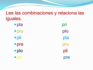 Este documento presenta varias actividades para identificar y practicar las combinaciones de letras "pl" y "pr" en palabras y oraciones cortas. Incluye ejercicios de relacionar palabras con imágenes, emparejar silabas con imágenes y recomienda sitios web para reforzar estas combinaciones.