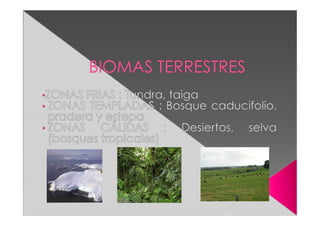 El documento describe el sistema de clasificación de zonas de vida propuesto por Leslie Holdridge en 1947, el cual divide los ecosistemas en 108 zonas dependiendo de factores ambientales como humedad y temperatura. Explica que Perú cuenta con 84 de estas zonas de vida que incluyen desiertos, bosques secos y húmedos. Detalla los tres principales biomas de Perú - desierto, páramo y selva - y describe algunas de sus características.