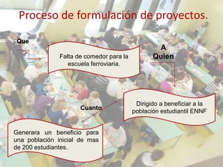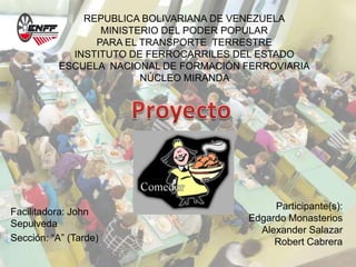Este documento presenta un proyecto para crear un comedor para la Escuela Nacional de Formación Ferroviaria en Venezuela. Actualmente la escuela carece de un comedor para sus más de 200 estudiantes. El proyecto propone presentar la necesidad de un comedor ante el Ministerio de Educación y otros organismos competentes para obtener fondos para su construcción y operación.