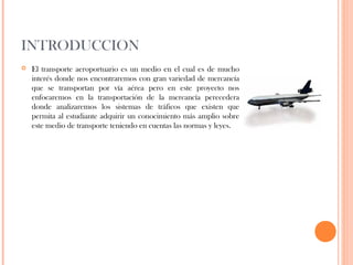 Este documento resume la estructura de los sistemas de tráfico de carga perecedera en aeropuertos. Describe las responsabilidades del transportista aeroportuario y expedidor de acuerdo a la normatividad colombiana. Explica los tipos de vehículos para transporte de mercancías perecederas y los requisitos para el transporte de animales.
