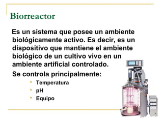 Un biorreactor es un sistema que mantiene las condiciones ambientales para un cultivo vivo en un ambiente controlado, como la temperatura y el pH. Existen diferentes tipos de biorreactores como los de tanque agitado, air lift y de columna. Los biorreactores también pueden operar en modo batch, batch alimentado o continuo. El objetivo principal de un biorreactor es proporcionar un ambiente controlado que maximice la producción y el crecimiento del cultivo de manera eficiente.