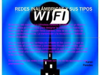 Este documento describe los tres tipos principales de redes inalámbricas: redes de área personal inalámbricas, redes metropolitanas inalámbricas y redes de área amplia inalámbricas. Explica las tecnologías clave de cada tipo de red, incluidos Bluetooth, WiFi, WiMAX y redes celulares.