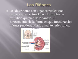 Los riñones son órganos vitales que filtran la sangre para eliminar desechos y exceso de agua, convirtiéndolos en orina. Cumplen muchas funciones de limpieza y equilibrio químico. Casi todas las enfermedades de los riñones atacan las nefronas y les hacen perder su capacidad de filtración, aunque a veces esto puede ocurrir rápidamente por lesión o intoxicación, la mayoría destruyen las nefronas lentamente. La diabetes puede dañar los riñones si no se