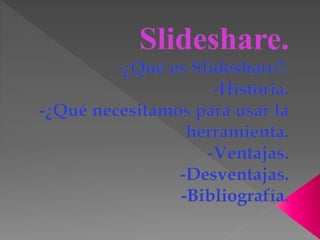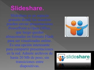 Slideshare es una plataforma gratuita lanzada en 2006 que permite a los usuarios subir y compartir presentaciones en formato flash, con un límite de 20 MB por archivo. El sitio, adquirido por LinkedIn en 2012, recibe aproximadamente 56 millones de visitantes únicos al mes y compite con servicios como Scribd e Issuu. Ofrece interacción a través de comentarios, aunque no permite modificaciones en los archivos publicados ni la visualización de animaciones o videos insertados.