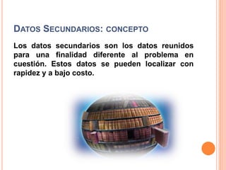 Este documento describe los datos secundarios y la investigación cualitativa. Explica que los datos secundarios son datos recopilados con un propósito diferente al problema actual y pueden encontrarse rápido y de bajo costo. También describe las ventajas y desventajas de los datos secundarios, así como diferentes tipos de datos secundarios internos y externos. Finalmente, define la investigación cualitativa como una metodología exploratoria sin estructura que proporciona comprensión del problema y puede usarse para explicar hallazgos cuantitativos.