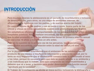 Este documento discute el tema del embarazo en adolescentes. Explica que la adolescencia es una etapa de transición entre la niñez y la adultez que generalmente ocurre entre los 13 y 19 años. Luego, introduce el tema del embarazo en adolescentes y sus consideraciones psicosociales. Finalmente, presenta un resumen de los 13 capítulos que componen el documento, los cuales abordan conceptos sobre la adolescencia y el embarazo adolescente, factores de riesgo, control del embarazo, mortalidad y morbilidad materna, abort