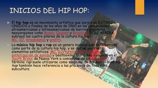 El hip hop surgió a finales de los años 1960 en comunidades afroamericanas y latinoamericanas de Nueva York. Consiste en cuatro elementos: MCing (rapping), DJing (turntablism), breakdancing, y grafiti. El hip hop comenzó en el Bronx en los años 1970 a través de la unión del MC y el DJ. Más tarde, los MCs incorporaron rimas breves y temas sexuales y escatológicos para entretener a la audiencia. Kool Herc & the Herculoids fueron el primer grupo reconocido, aunque