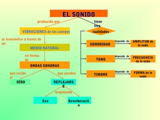 El sonido se produce por las vibraciones de los cuerpos y se transmite a través de un medio como el aire en forma de ondas sonoras. Estas ondas sonoras tienen tres cualidades principales: sonoridad, que depende de la amplitud de la onda; tono, que depende de la frecuencia de la onda; y timbre, que depende de la forma de la onda. El oído capta estas ondas sonoras y el cerebro las interpreta como sonidos.