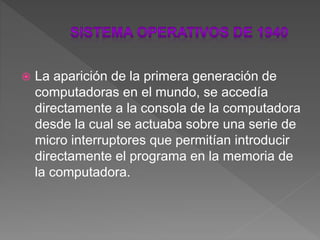 El documento resume la evolución de los sistemas operativos desde las primeras generaciones de computadoras hasta la década actual. Se mencionan los primeros sistemas operativos simples como el monitor residente y el procesamiento por lotes. Luego surgen sistemas más avanzados como BeOS, GNU/Linux, Windows NT, FreeBSD, OS X y Haiku en las décadas de 1990 y 2000. Finalmente, en la década actual se destacan Illumos y OpenIndiana como sistemas operativos de código abierto.