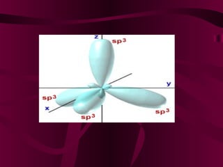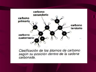 El documento describe los conceptos clave de la química orgánica, incluyendo la hibridación del carbono, los tipos de átomos de carbono, las fórmulas químicas y la nomenclatura de los hidrocarburos como los alcanos. Explica que los alcanos son compuestos orgánicos formados solo por carbono e hidrógeno unidos por enlaces simples, y que su fórmula general es CnH2n+2.