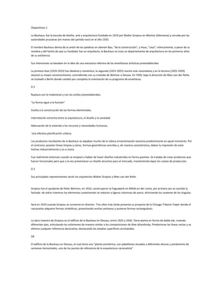 La Bauhaus fue una escuela de arte y diseño fundada en Alemania en 1919 con el objetivo de reformar la enseñanza artística. Bajo la dirección de Walter Gropius y Mies van der Rohe, la Bauhaus promovió un estilo racionalista que priorizaba la forma siguiendo a la función, usando materiales industriales como el vidrio, el acero y el hormigón. Su edificio en Dessau, con su planta asimétrica y ventanas horizontales, se convirtió en un punto de referencia de la arquitectura moderna