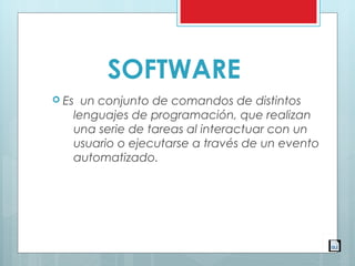 Este documento presenta un resumen breve sobre los componentes básicos de un computador, incluyendo software, HTML, hosting, FTP, servidores, sitios web, dominios, hipertexto, navegadores y el origen de Internet. Explica conceptos como lenguajes de programación, estructura de páginas web, alojamiento en servidores, transferencia de archivos y navegación entre documentos enlazados.