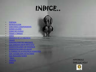 Este documento discute la violencia doméstica y la codependencia. Explica que la violencia doméstica ocurre en un ciclo de tres fases: acumulación de tensión, episodio agudo de violencia y etapa de calma. Las víctimas a menudo sufren daños físicos, psicológicos y morales graves. El documento también describe las manifestaciones de violencia psicológica y abuso, y explica que aunque la violencia no se justifica, a veces las víctimas se vuelven violentas debido al abuso que han