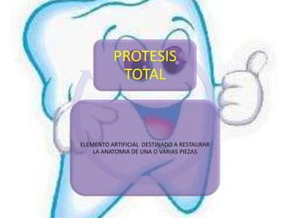 Una prótesis total es un elemento artificial que se usa para restaurar la anatomía de una o más piezas faltantes en la boca. Existen prótesis removibles y no removibles, así como prótesis mixtas que se colocan sobre implantes. Las prótesis se fabrican con materiales como resina, metal o cerámica. Es importante limpiar la prótesis después de cada comida y retirarla para dormir para mantener la salud bucal.